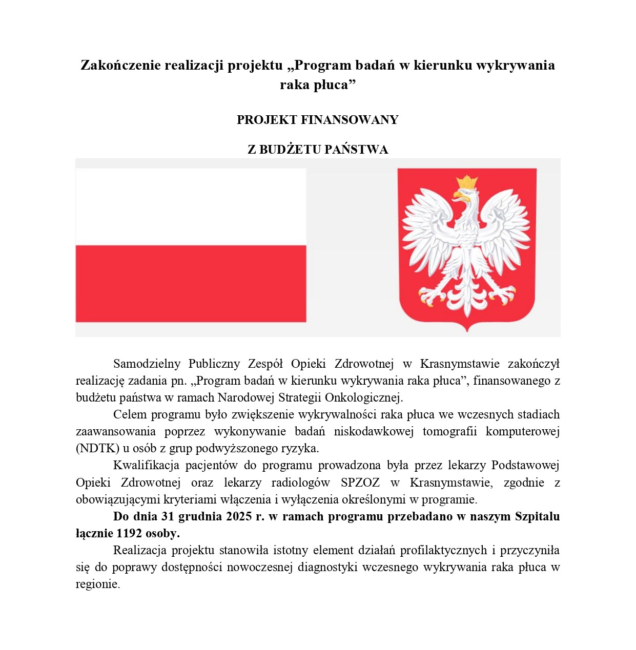 Zakończenie realizacji projektu „Program badań w kierunku wykrywania raka płuca”
